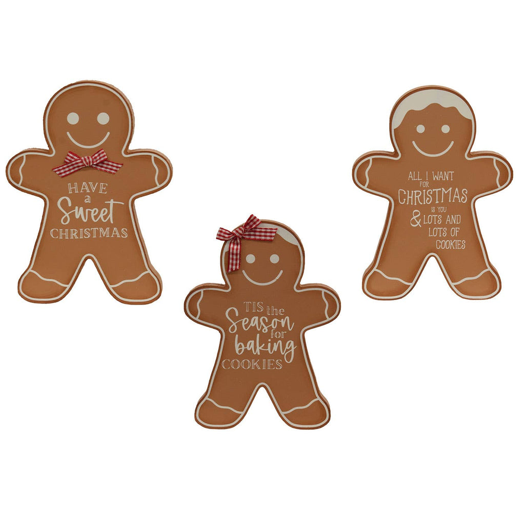 Bring sweet smiles to the farmhouse this holiday season with the Christmas Words Gingerbread Sitters. These wooden sitters have a classic gingerbread man shape with toasty warm brown coloring and accents in white. Each has a festive phrase in white text and script. The largest measures 8" high by 5.75" wide by .75" deep. It has a red and white gingham bow at the neck and reads 'Have a Sweet Christmas.' The medium sitter states 'All I want for Christmas is You & Lots and Lots of Cookies.' It measures 7.75" high by 5.5" wide by .75" deep. The smallest has a red and white gingham bow in its hair and reads 'Tis the Season for baking cookies.' It measures 7" high by 5" wide and .75" deep. This set is a perfect fit in holiday kitchen or baking displays. They look darling displayed together or tucked into separate displays.