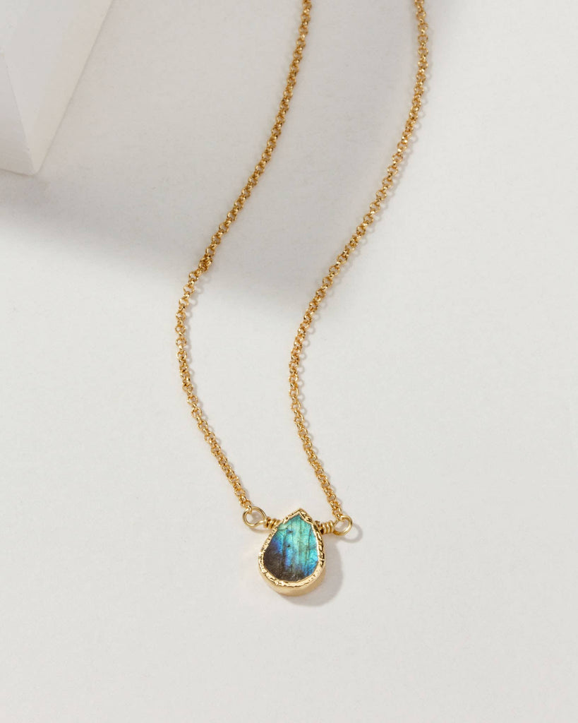 Style Details: 14kt gold plated brass Labradorite (Each stone is unique. Size and shape may vary slightly). Chain Length: 16" with 2" extender Assembled in the USA with imported components. Packaging styles may change color every season