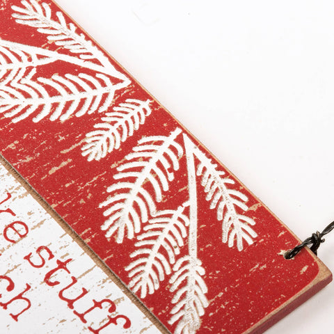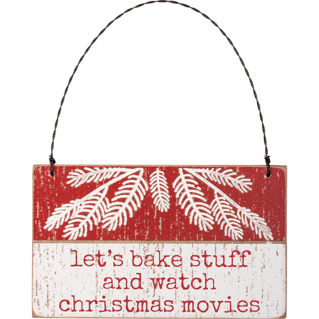 A rustic slat wood Christmas ornament featuring a typeset "Let's Bake Stuff And Watch Christmas Movies" sentiment with debossed evergreen branch designs. Our Bake Stuff Christmas ornament easily hangs by twisted wire loop.