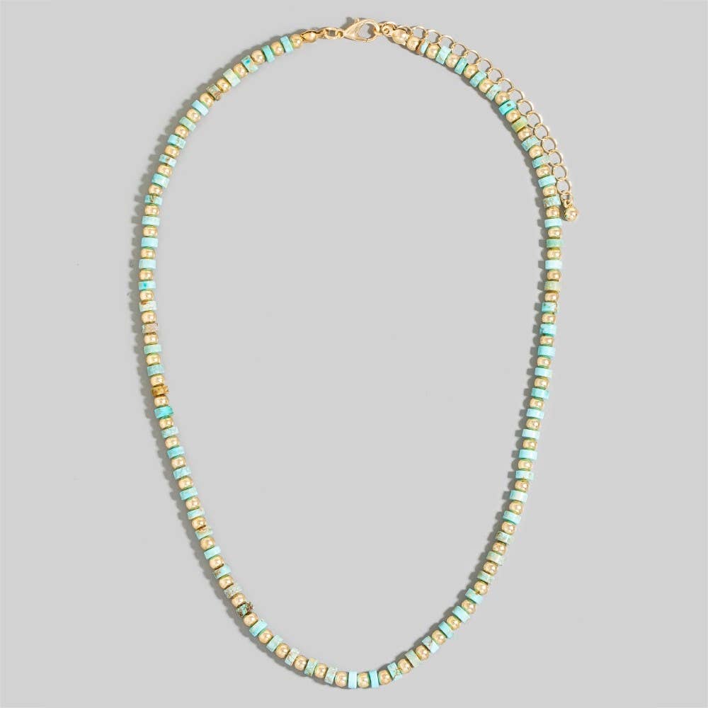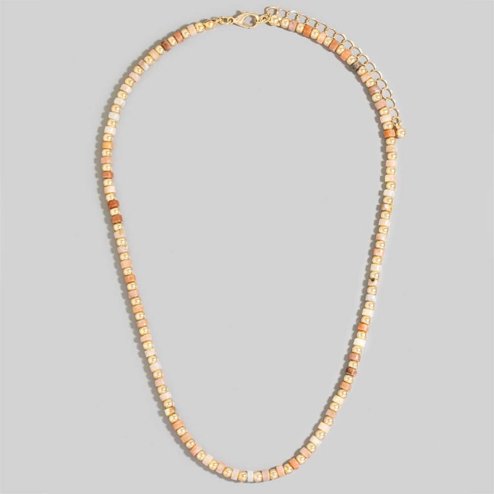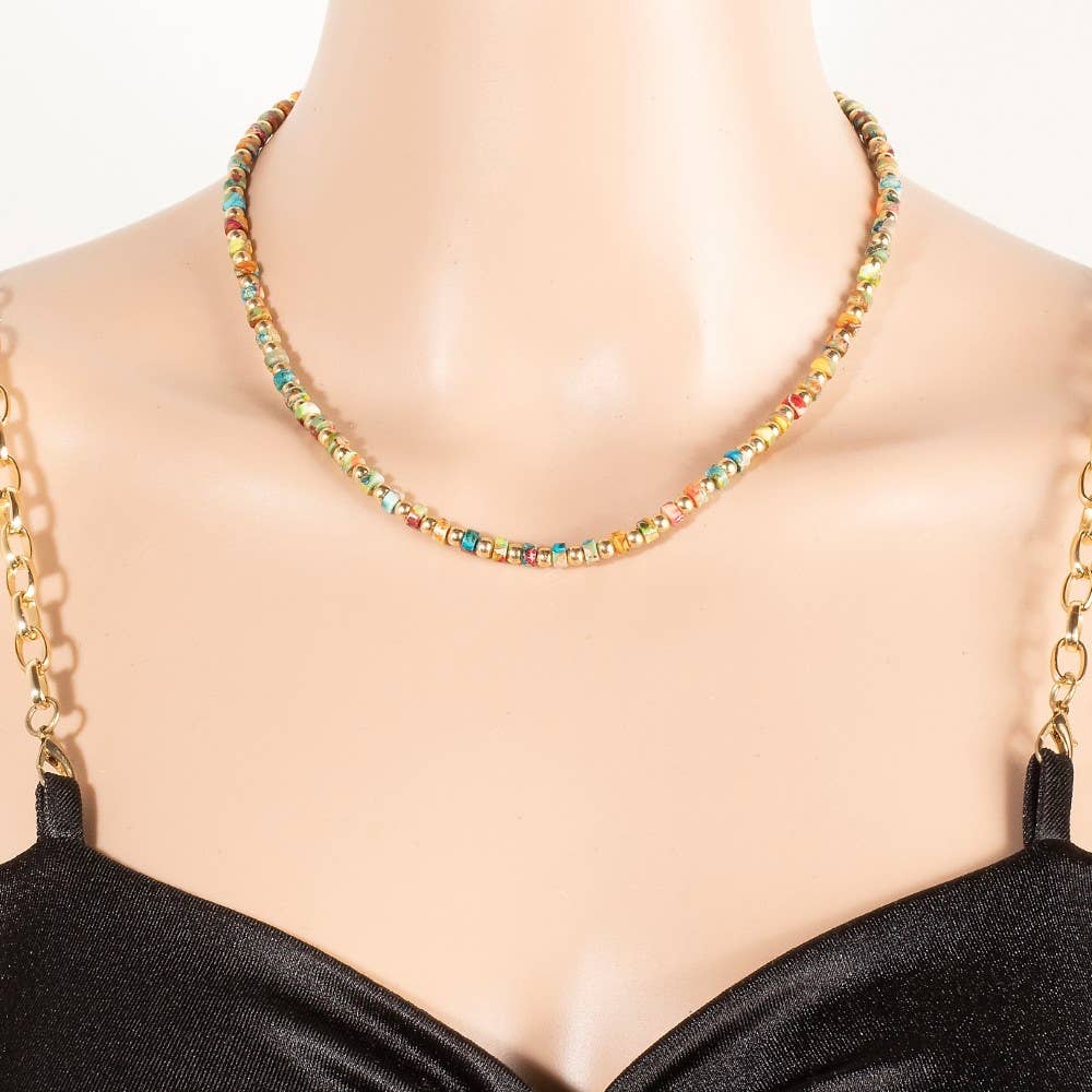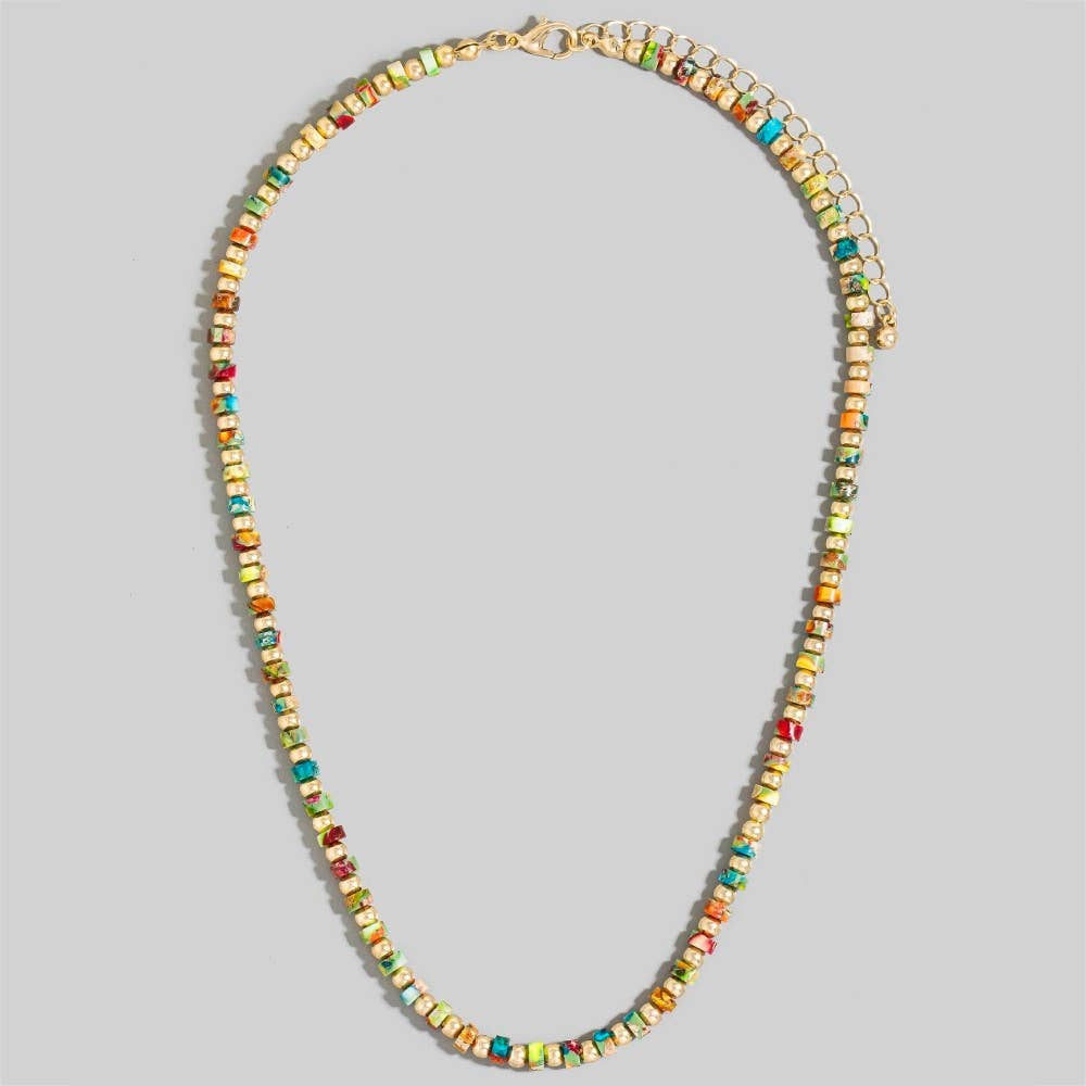 This necklace brings a stunning metallic and semi-precious stone beaded style. Immerse yourself in the details of design, as this necklace effortlessly becomes a conversation starter. 50% SEMI PRECIOUS 45 PLASTIC 5% ALLOY