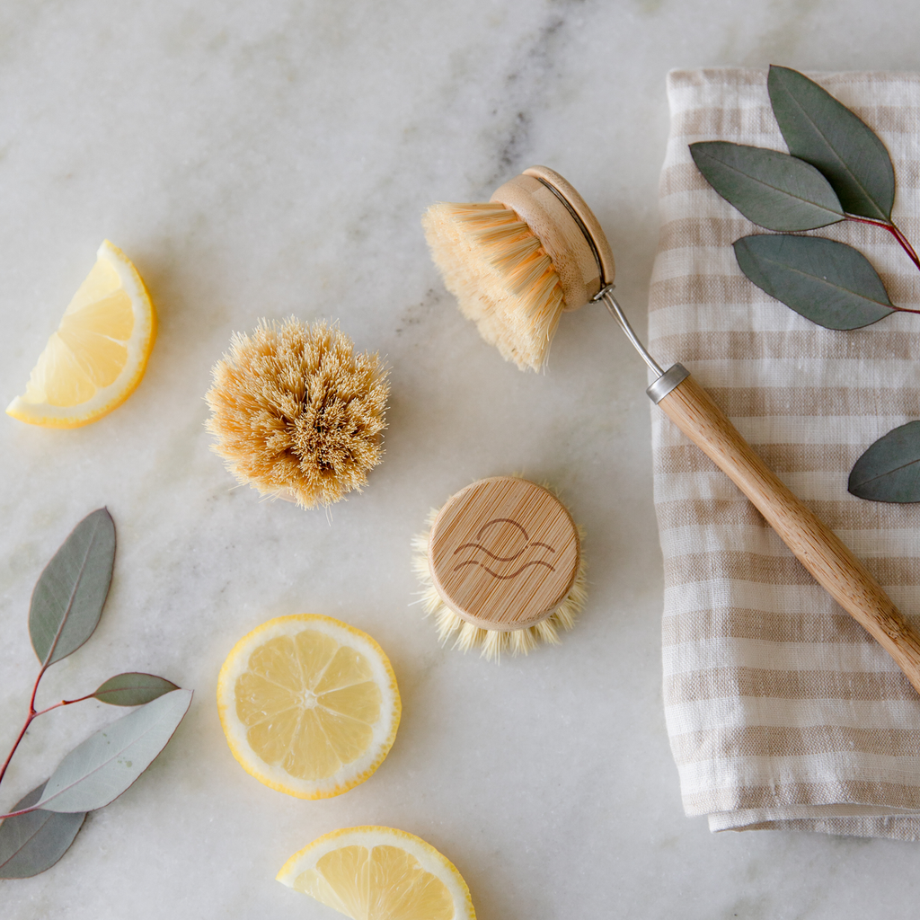 This is a classic eco-friendly wooden dish brush made with sustainably sourced bamboo handle and head with white sisal fiber bristles that will biodegrade at the end of their life. Once bristles wear out, simply take off the head and replace with a new one. This cleaning brush is a perfect plastic-free alternative to plastic sponges and scrubbers for washing dishes, sink, stove, tiles, etc.
