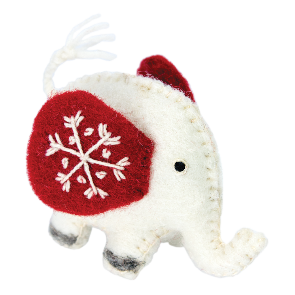 This playful pachyderm is red, white and be-autiful! Charming details and high-quality Fair-Trade handwork make this hand-felted holiday ornament extra special. Artisans in Nepal use 100% natural wool and non-toxic dyes to assemble keepsake gifts. A festive 'Fair Trade Holiday' tag hangs from a 3" hanging loop. Made exclusively for dZi Handmade, member Fair Trade Federation. 4"h x 4"w x 1"d