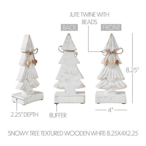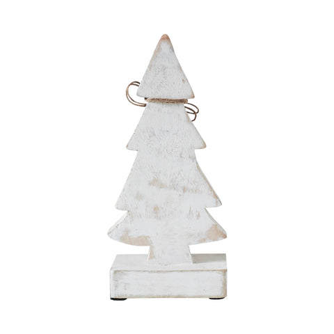 Transform your home into a winter wonderland with the charming Wood Snowy Tree. Crafted from sturdy tropical wood, this textured figurine showcases a full Christmas tree design complete with a rustic twine bow, measuring 8.25 inches in height, 4 inches in width, and 2.25 inches in depth. Its intricate detailing and snowy finish evoke the serene beauty of a winter landscape, making it a delightful addition to tabletops, shelves, or mantels in your dining room, entryway, living room, and beyond. In a timeless antique white hue, this wooden Christmas tree exudes vintage charm, infusing your holiday decor with a touch of nostalgic allure. Its primitive style and distressed appearance add authenticity and rustic appeal, evoking memories of cozy gatherings and cherished traditions. Whether displayed alone as a centerpiece or grouped with other seasonal accents, this figurine brings warmth and festive cheer to any indoor setting, creating a cozy ambiance for joyful celebrations with family and friends.