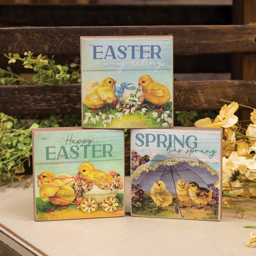 Vintage Chicks Square Blocks are square wooden decor pieces made with vintage-inspired spring style. The blocks feature photo-realistic design with a distressed finish and unpainted edges. One block depicts a trio of baby chicks under a parasol and reads, "spring has sprung." One block depicts a pair of chicks working together to tie a bow around an egg and reads, "Easter greetings." One block depicts one baby chick pulling another along in a floral cart and reads, "happy Easter." Each block features freestanding design for stable display on a flat surface, while pre-drilled keyhole hangers allow for versatile hanging display. Each measures 4" high by 4" wide by .75" deep.