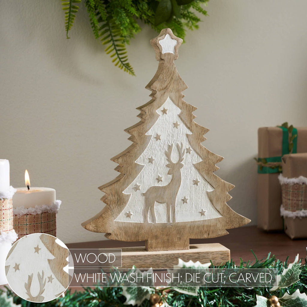 Bring a festive, handcrafted touch to your holiday decor with the Washed Winter Frolic Wooden Christmas Tree. Made from tropical wood, this decorative figurine features a cutout Christmas tree painted in a soft whitewash finish with a star on top. Intricate relief-cut details, including a reindeer and small stars, add visual interest, while the high points are gently distressed to reveal warm light tan undertones for a rustic, primitive look. Measuring 9 inches wide by 12 inches tall, this tree is mounted securely on a wooden base, making it easy to display on mantels, shelves, or tabletops. The subtle combination of white and light tan tones blends effortlessly with both traditional and modern farmhouse holiday themes. Its layered textures and charming woodland scene evoke a cozy, seasonal feel that enhances any space. Ideal for use in the bathroom, bedroom, dining room, entryway, kitchen, or living room, this winter tree adds character and warmth wherever it's placed.